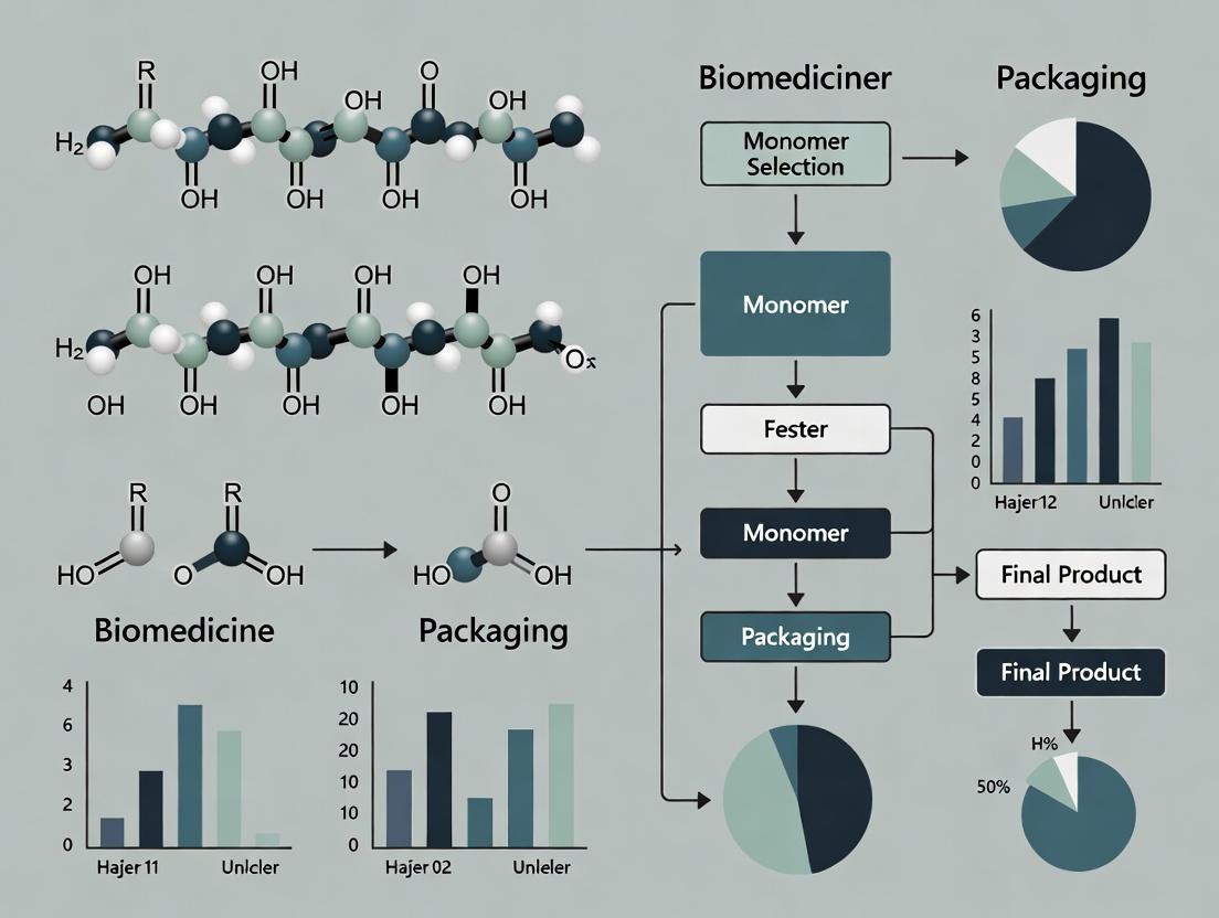 Synthesis: Typically produced via ring-opening polymerization (ROP) of lactide, derived from the fermentation of sugars (e.g., corn starch). Key Properties: High modulus, brittleness, transparency. Barrier properties are moderate for O₂ and CO₂ but poor for water vapor. Processing: Melt-processable via standard extrusion, injection molding, and thermoforming. Requires precise drying (~50°C under vacuum) to prevent hydrolysis.