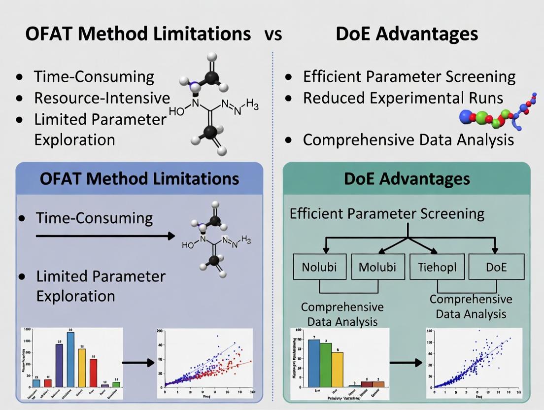 OFAT Approach: Variables are altered sequentially while holding others constant. This is intuitive but fails to capture interactions between factors. DoE Approach: A structured, statistical method that systematically varies multiple factors simultaneously to model their individual and interactive effects.