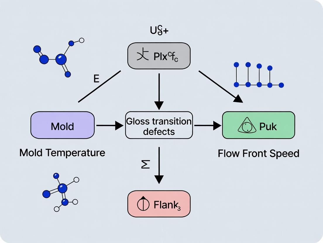 Q2: Our ABS components show glossy streaks in matte-finish areas. How is this related to mold temperature or flow? A2: This is a classic "gloss transition" defect. In ABS, surface finish is determined by the replication of the mold surface texture. Glossy streaks occur where the polymer melt contacts and fully replicates the smooth mold surface, while matte areas result from micro-scale shrinkage away from textured surfaces. The defect is caused by localized variations in cooling and packing. High flow front speed can generate excessive shear heat, momentarily raising the local mold interface temperature and preventing effective texture replication. Increasing the overall mold temperature can sometimes homogenize the effect but may compromise the matte finish.