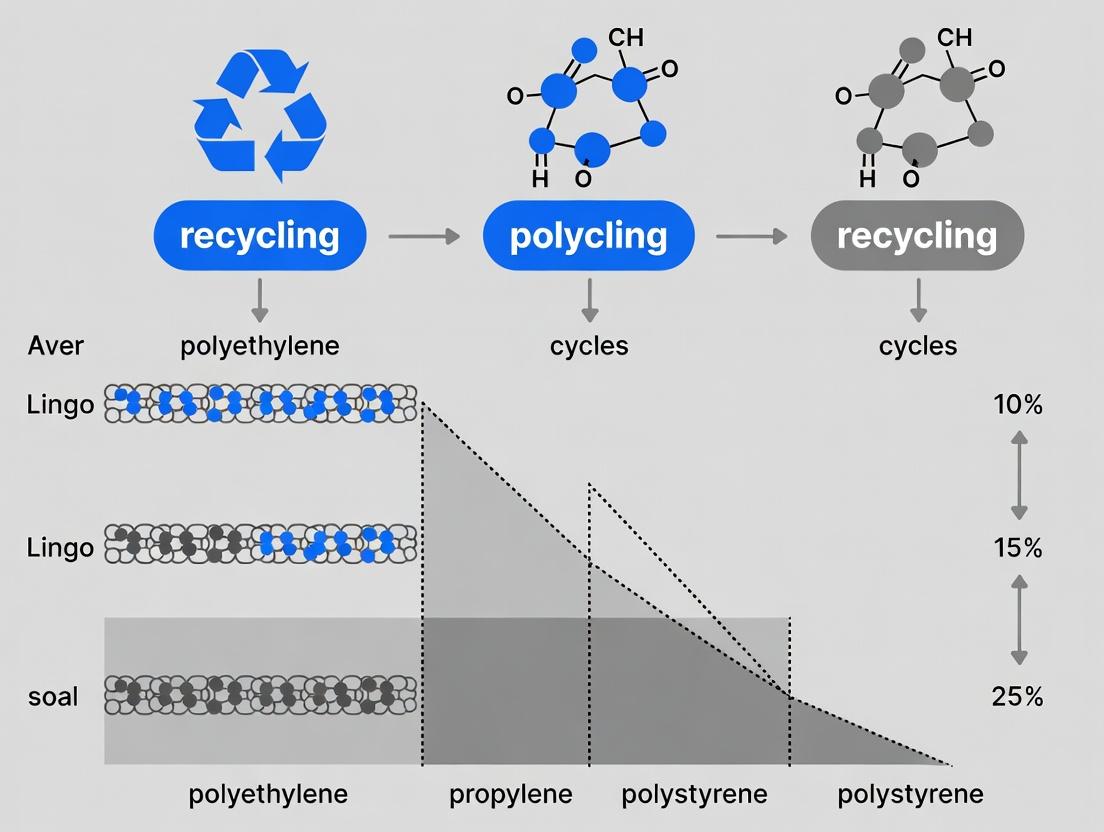 The systematic comparison of mechanical property retention across multiple recycling cycles reveals a complex landscape where polymer chemistry, processing history, and stabilization strategies intersect. Key takeaways indicate that semi-crystalline polymers like HDPE and PP generally outperform amorphous ones in retention of key properties, though all materials exhibit a non-linear decline, often with a critical threshold. Methodologically, comprehensive testing beyond basic tensile strength is crucial for application-specific validation. The integration of targeted additives and optimized processing emerges as the most viable path for extending polymer life. For biomedical and clinical research, these insights underscore the necessity of designing devices and packaging with not just first-use performance in mind, but also their potential for safe, performant reuse in a regulated circular economy. Future research must focus on developing novel, inherently recyclable polymers and real-time monitoring techniques to predict property fall-off, ultimately enabling smarter material life-cycle management.