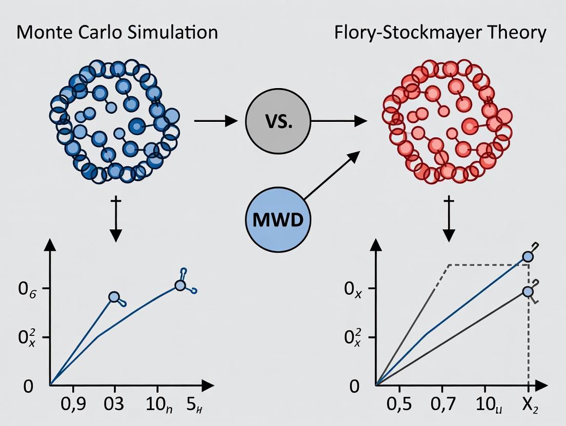 | Perfect Stoichiometry (r=1.0) | Standard reference prediction for gel point and MWD evolution. | Reference simulation. Includes finite-cycle formation. | F-S underestimates pre-gel PDI by ~15% compared to MC and experiment. |